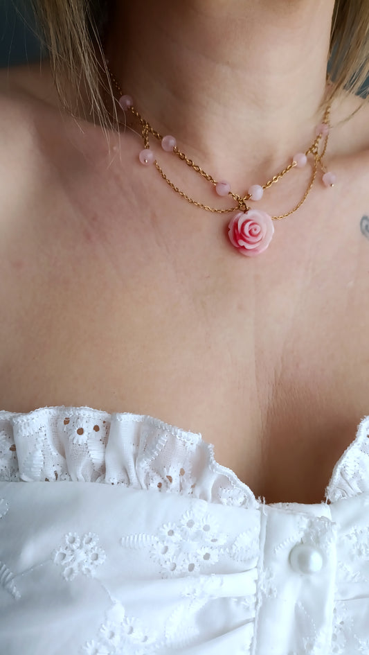 Collier Rose et quartz rose / Création de collier, Acier inoxydable, quartz rose
