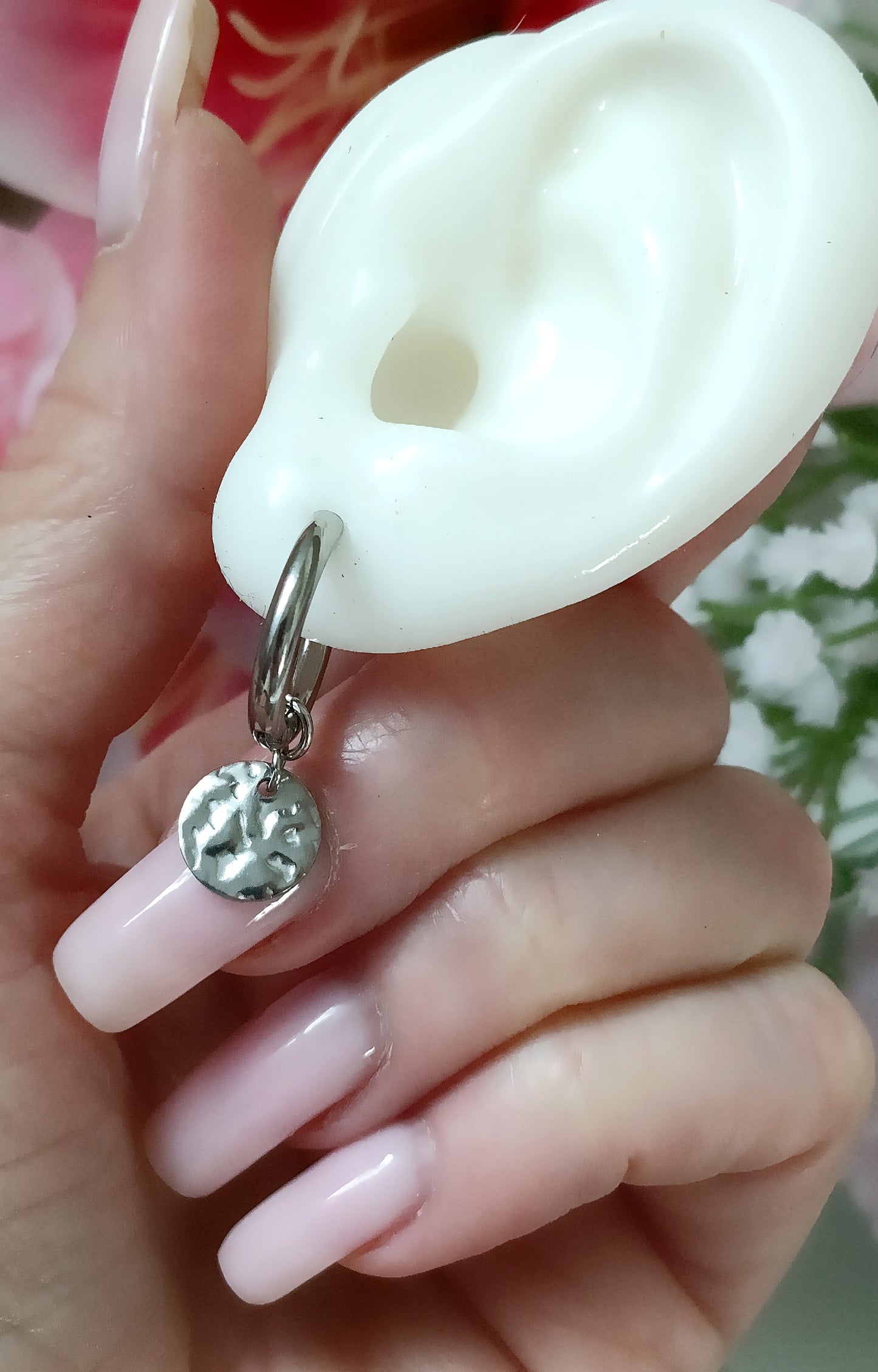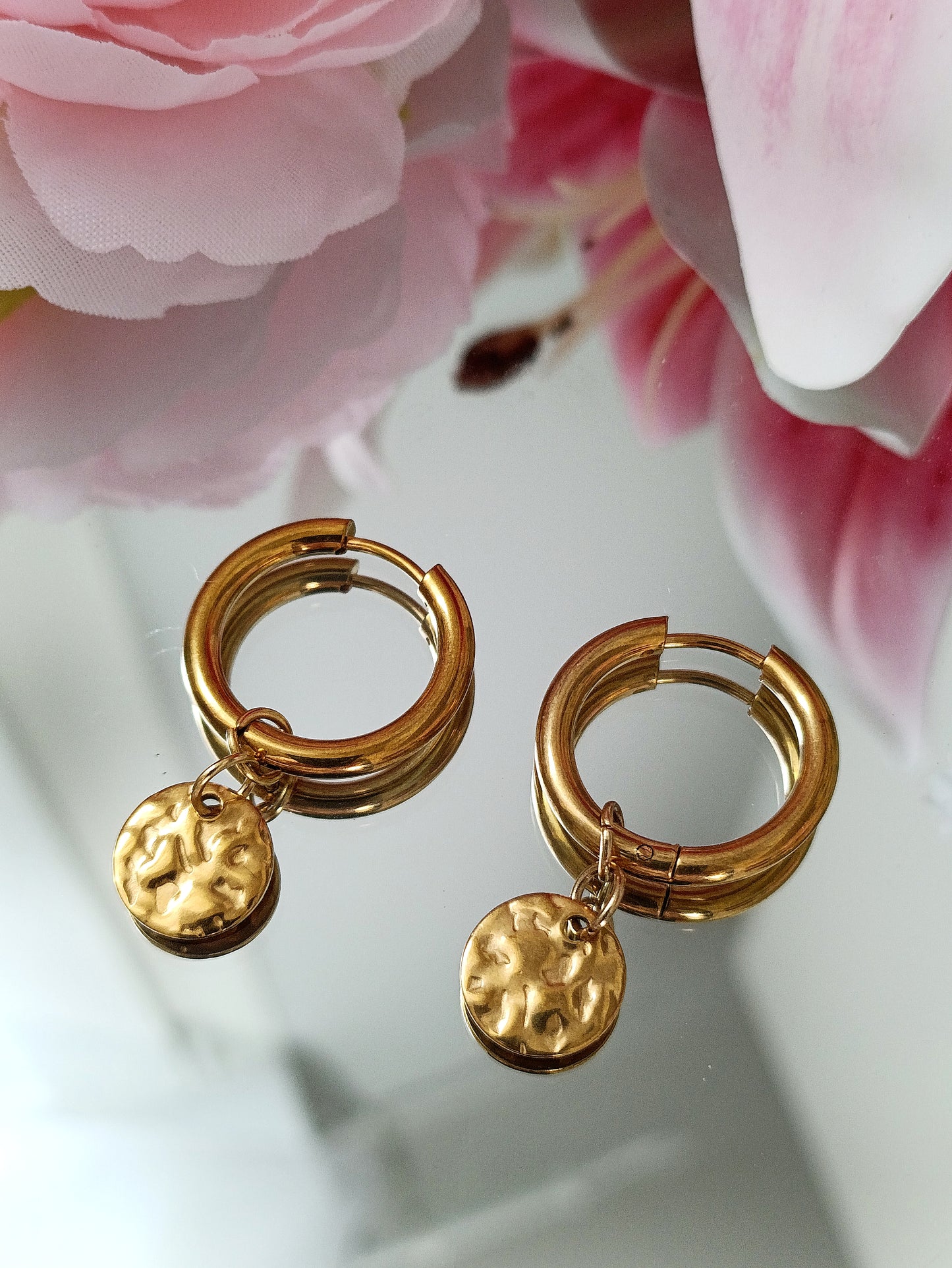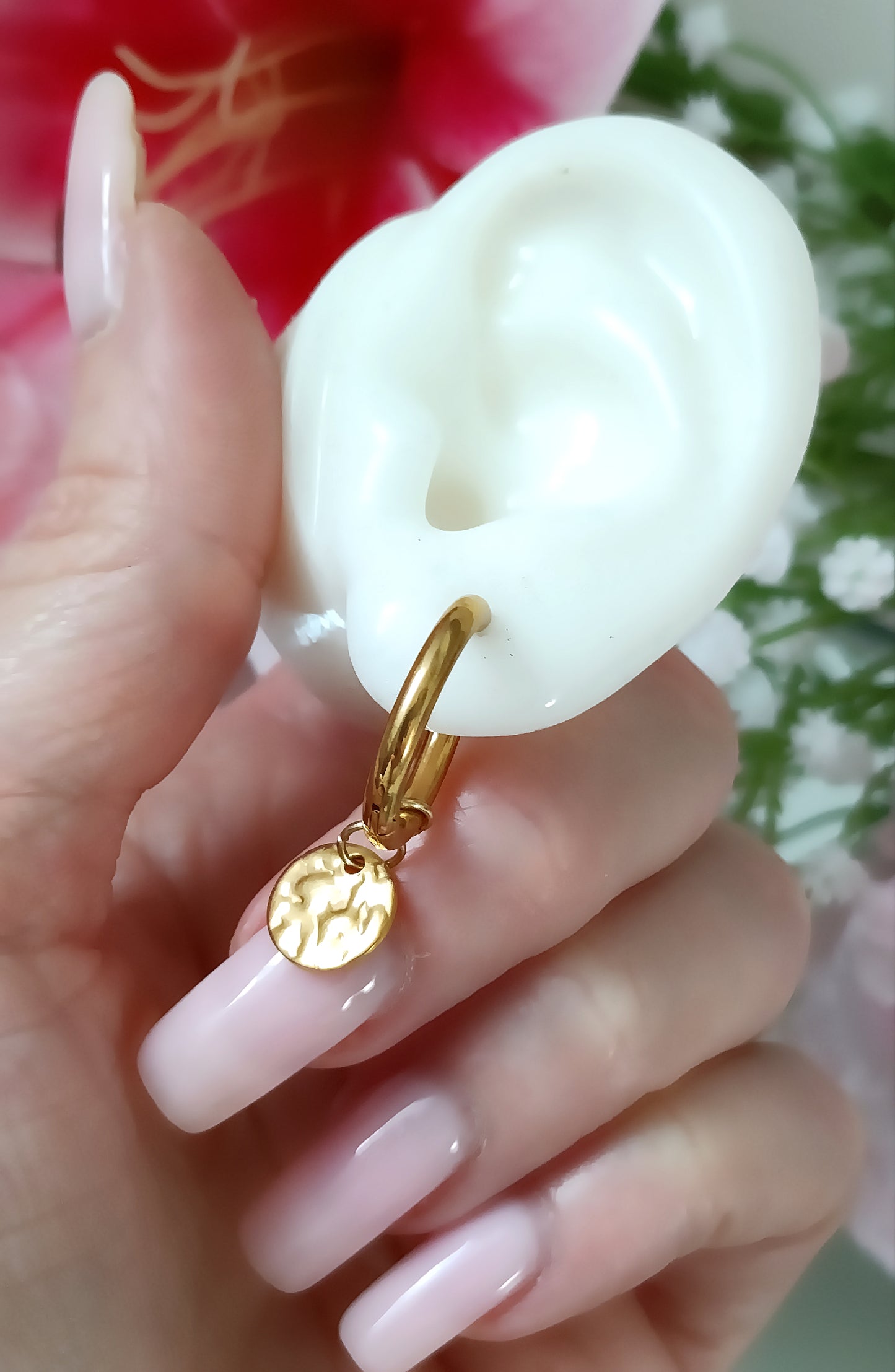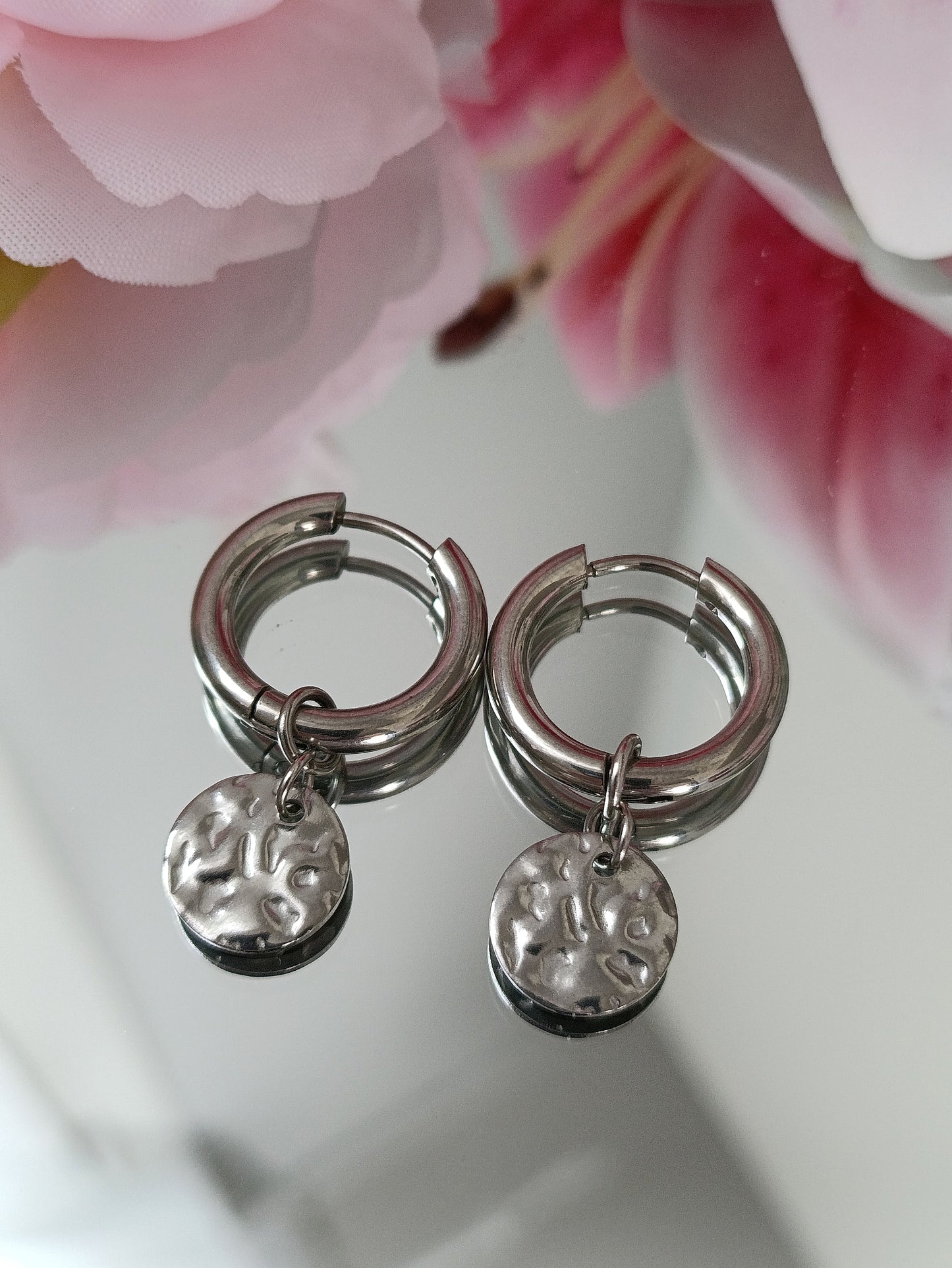 - Petites créoles ornée d'un pendentif cercle martelé en acier inoxydable.