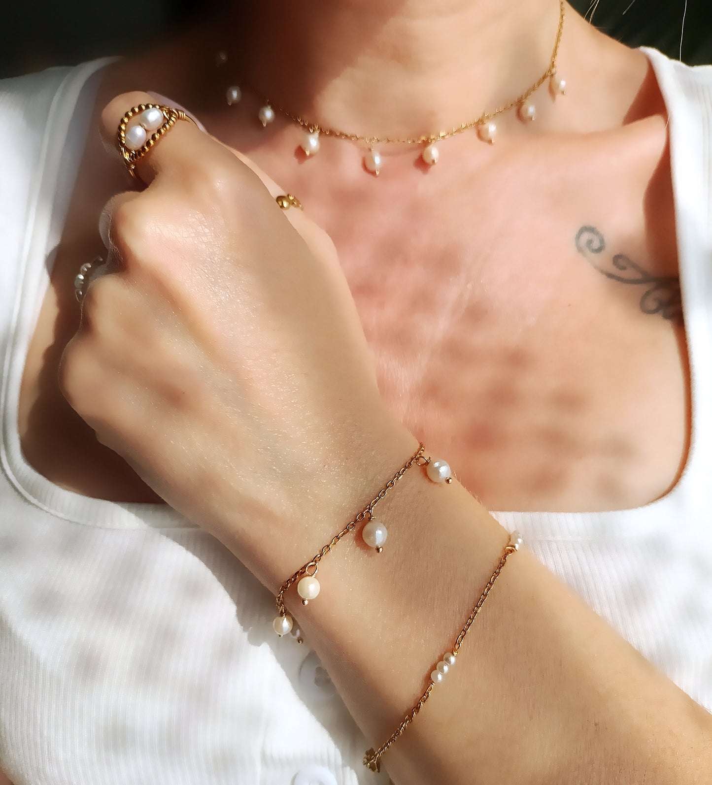 - Bracelet en maille fine ornée de perles d'eau douce choisies avec soin. Chaque perle est rajoutée à la main, afin d'obtenir une création pleine de douceur, de féminité