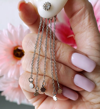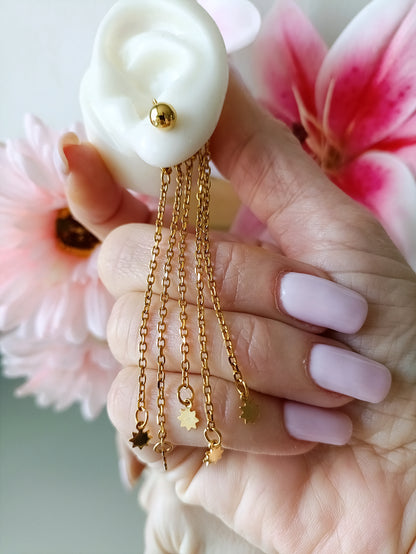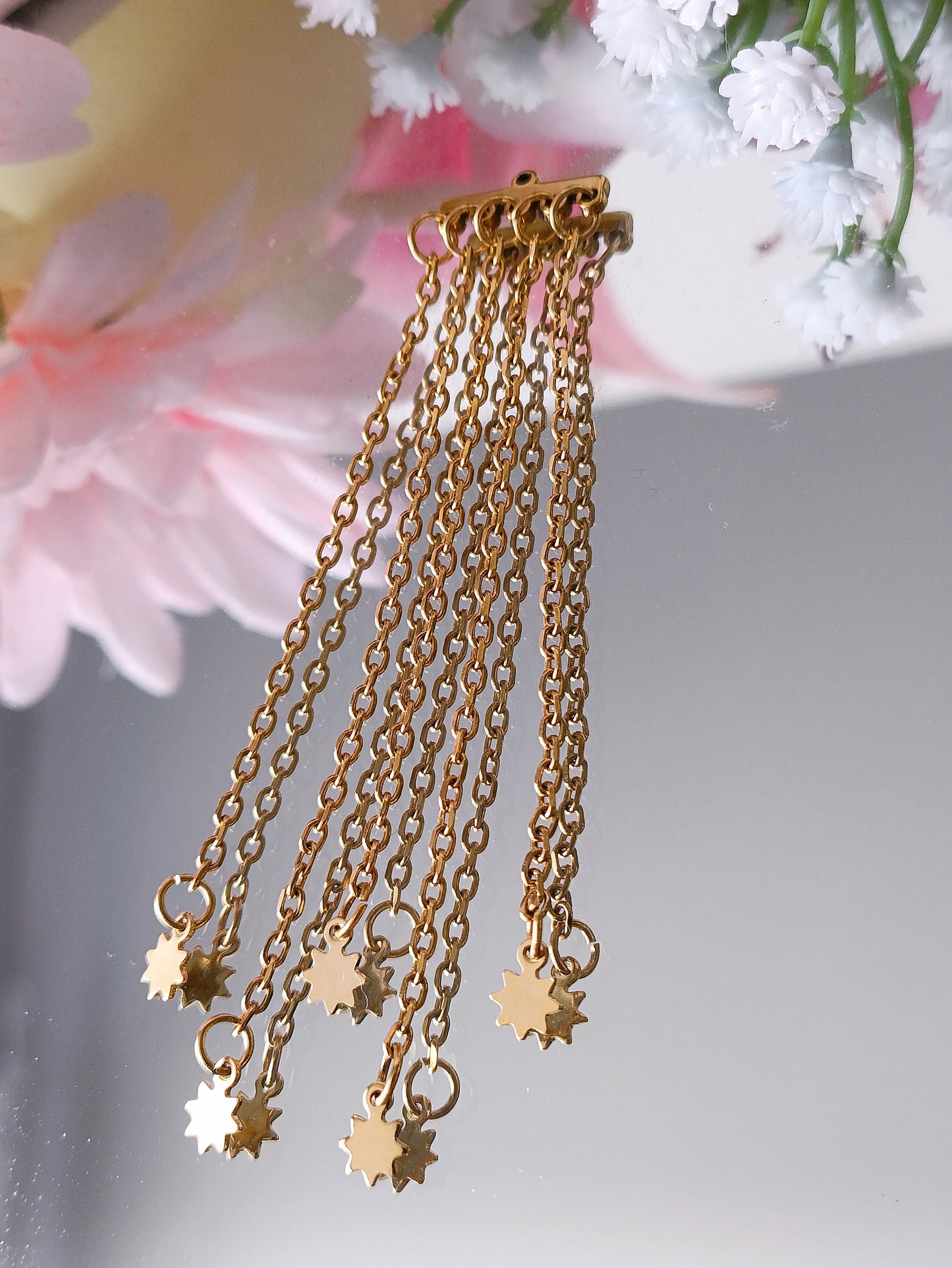 - Composition réalisée à partir de cinq fines mailles ornées de pendentifs étoiles.