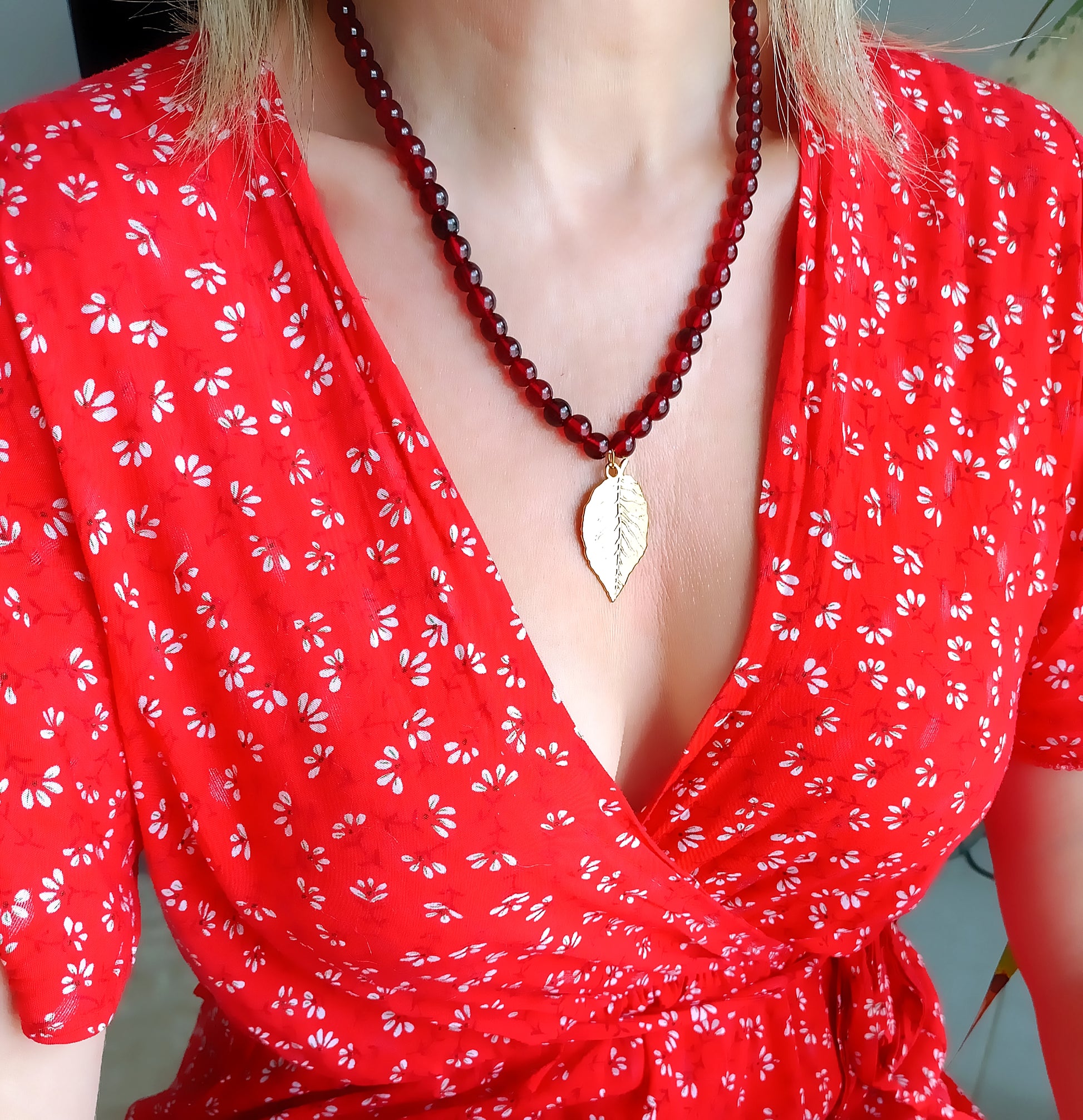 - Des perles de verre qui font penser à des framboises, des groseilles, associées à une feuille qui se glissera sur votre décolleté avec charme !