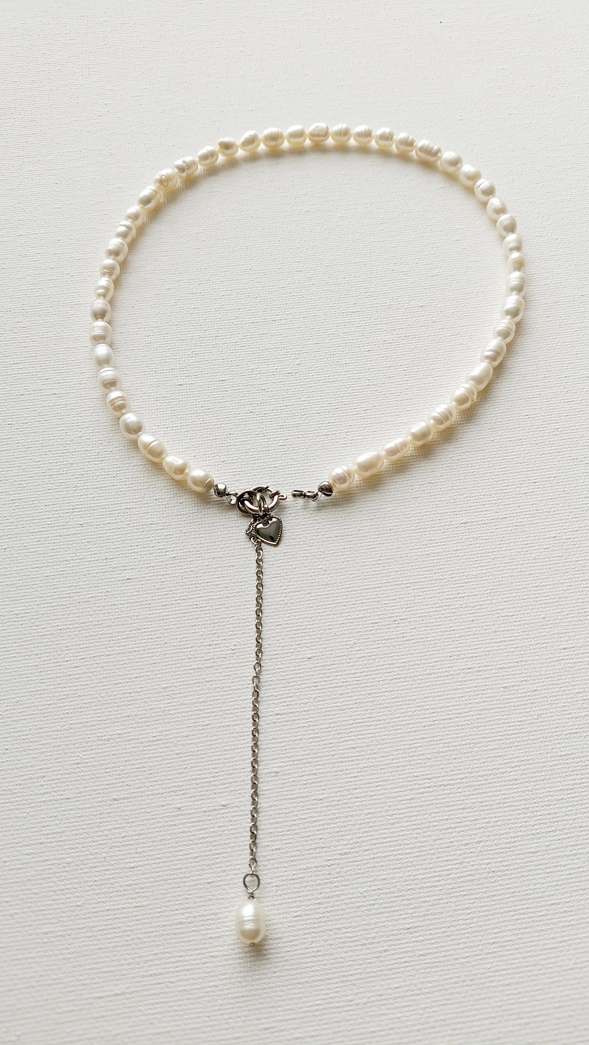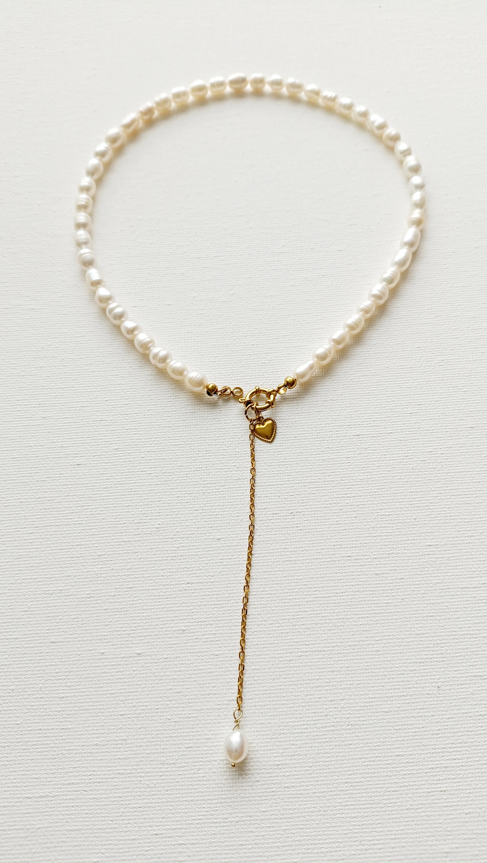 - Des perles d'eau douce authentiques montées à la main sur un câble en acier inoxydable, un fermoir mousqueton accompagné de deux pendentifs : une chaine ornée d'une perle d'eau douce, un petit cœur en acier.