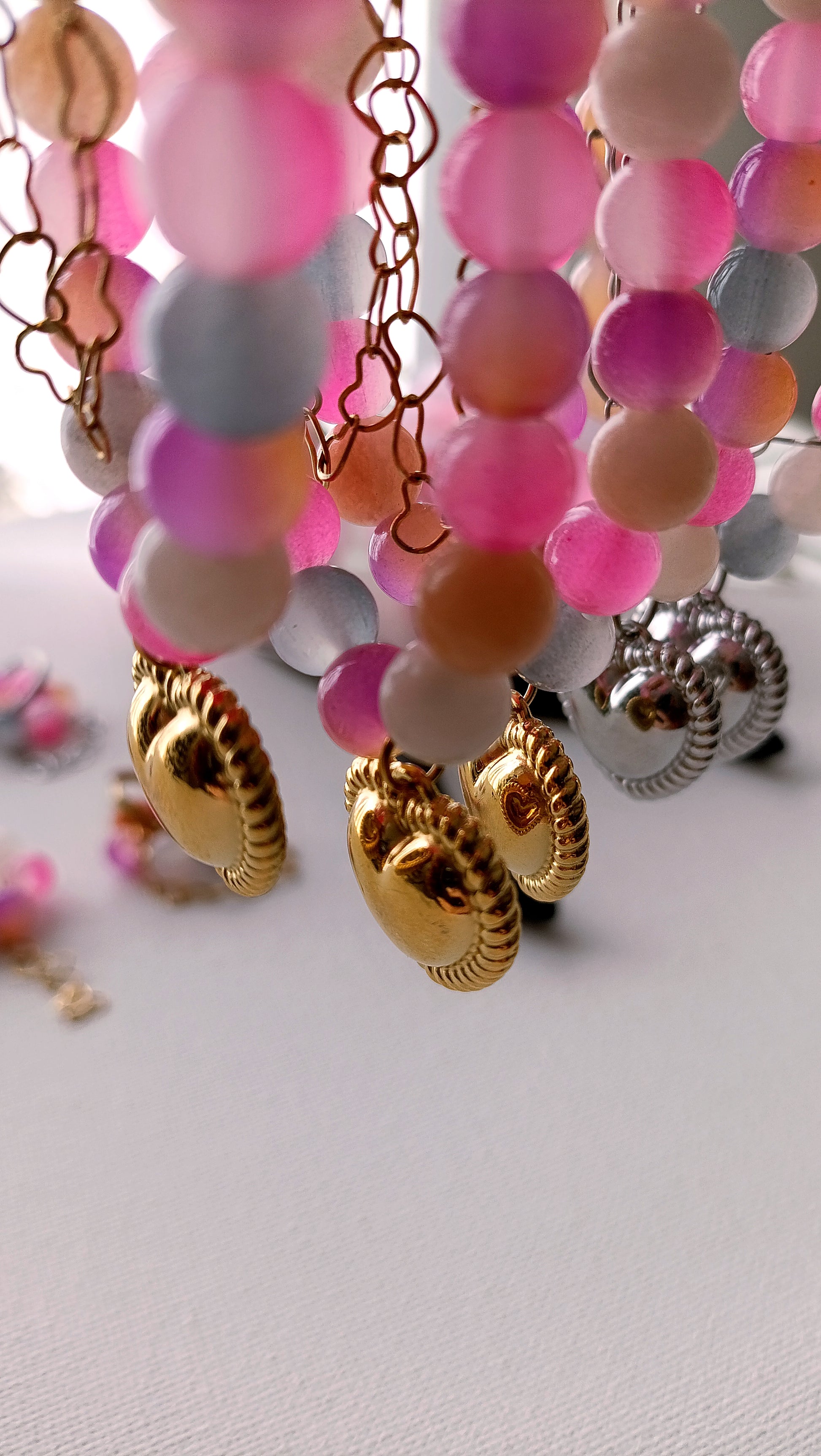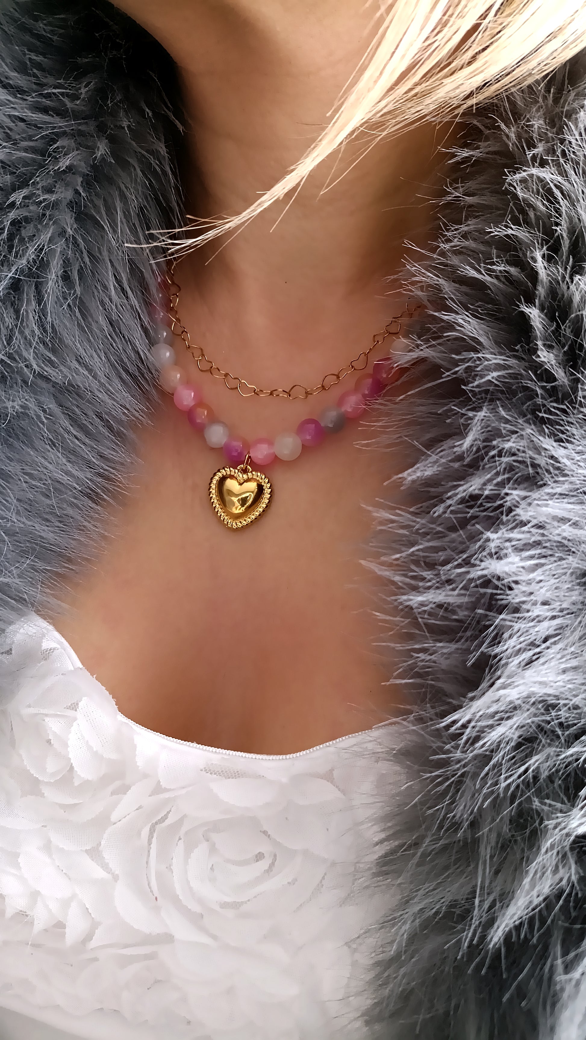 - Je l'ai donc créé avec des perles de verre aux couleurs réconfortantes, un pendentif en forme de cœur effet dentelle sur sa bordure et une maille cœurs terriblement féminine. Un collier double rang original qui se porte n'importe quelle saison.
