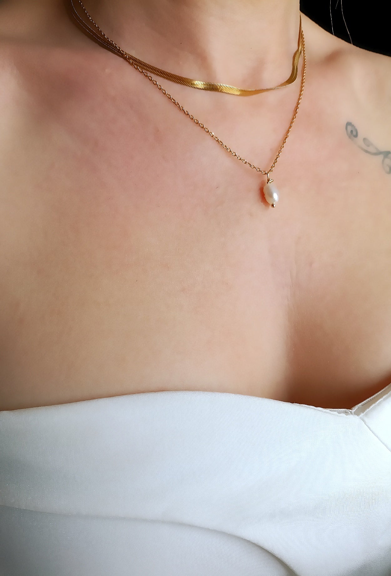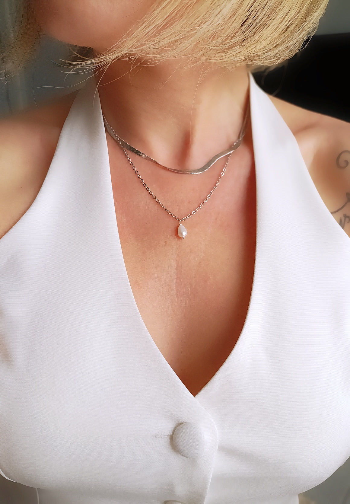 - Un collier à double rang. Maille serpent accompagnée d'une maille fine ornée d'une perle d'eau douce.