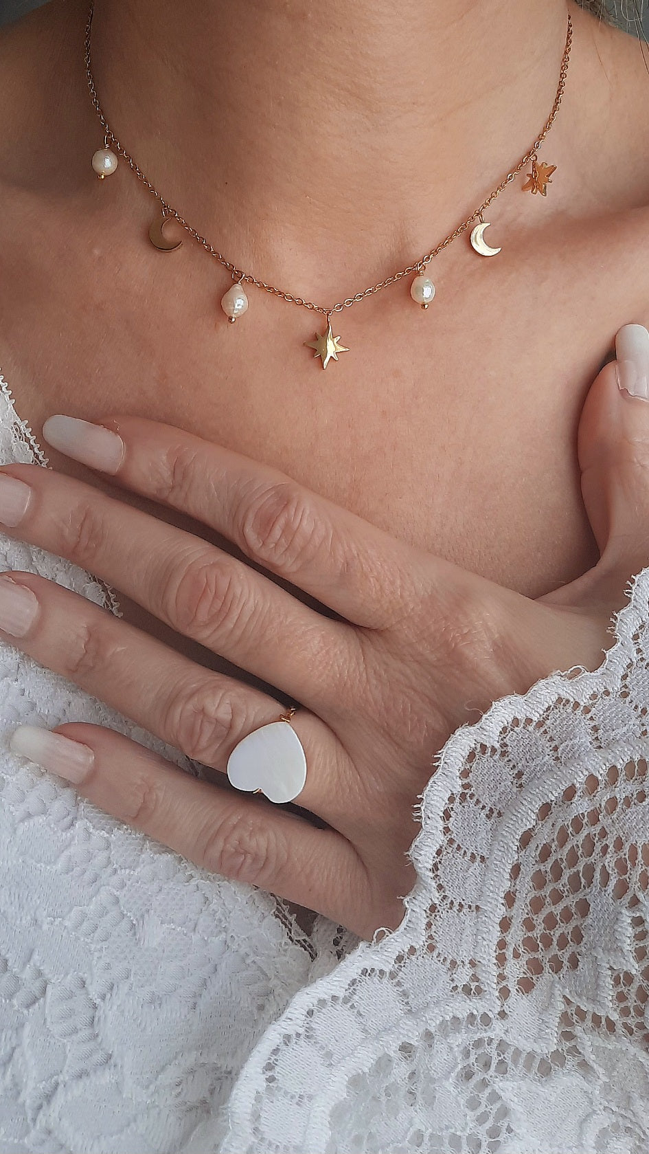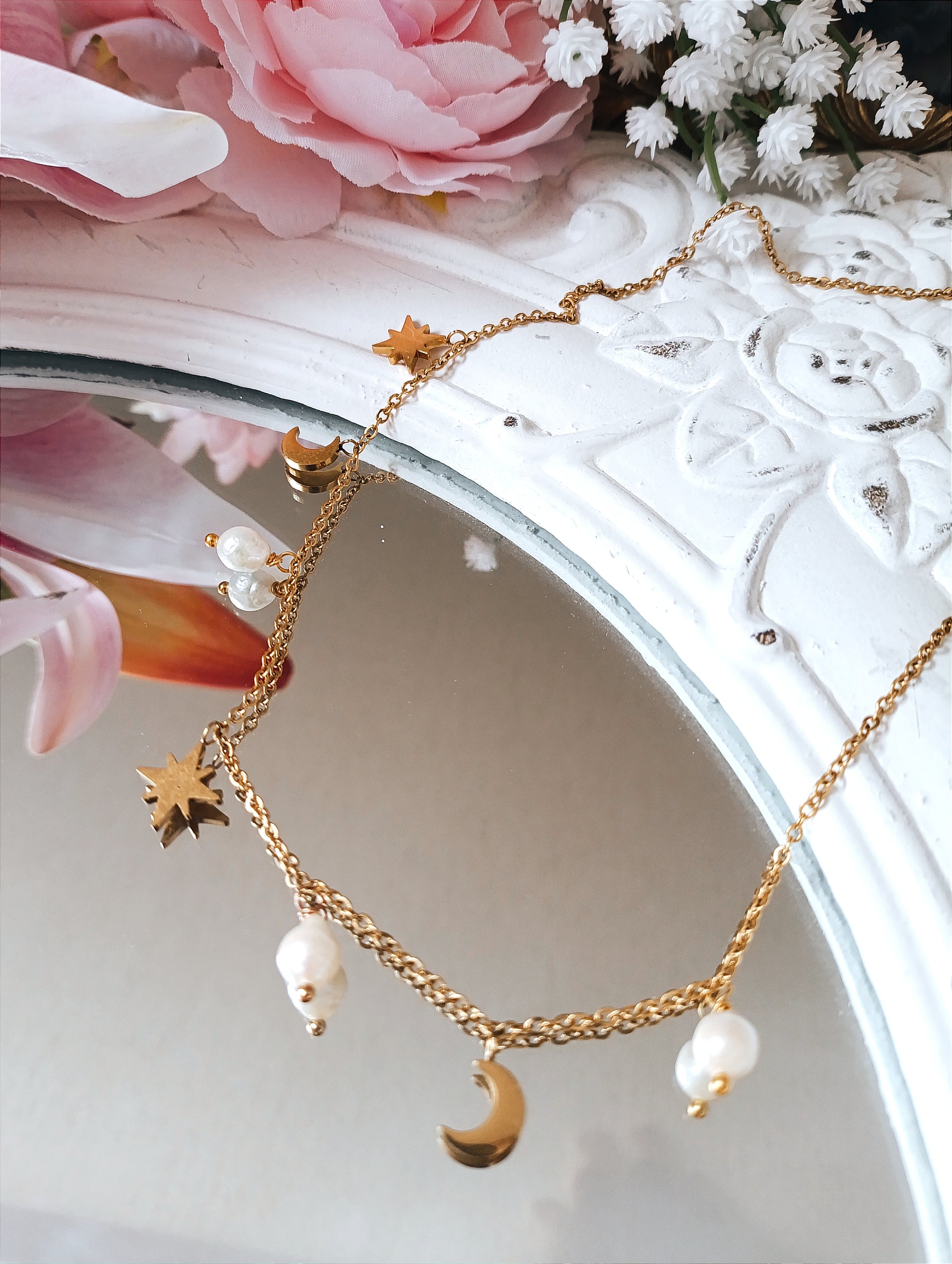 - Collier en acier inoxydable composé d'une maille fine ornée de petits pendentifs. Des étoiles, lunes, et des perles d'eau douce naturelles donnent à ma composition lumière, inspiration rêveries et féminité sur votre décolleté...